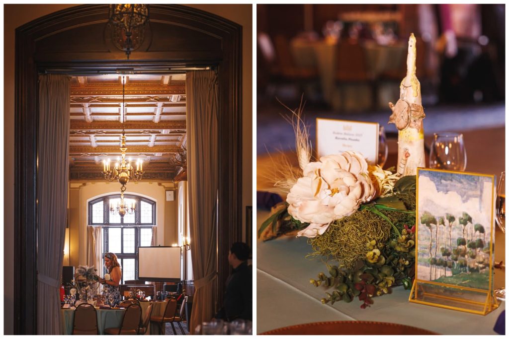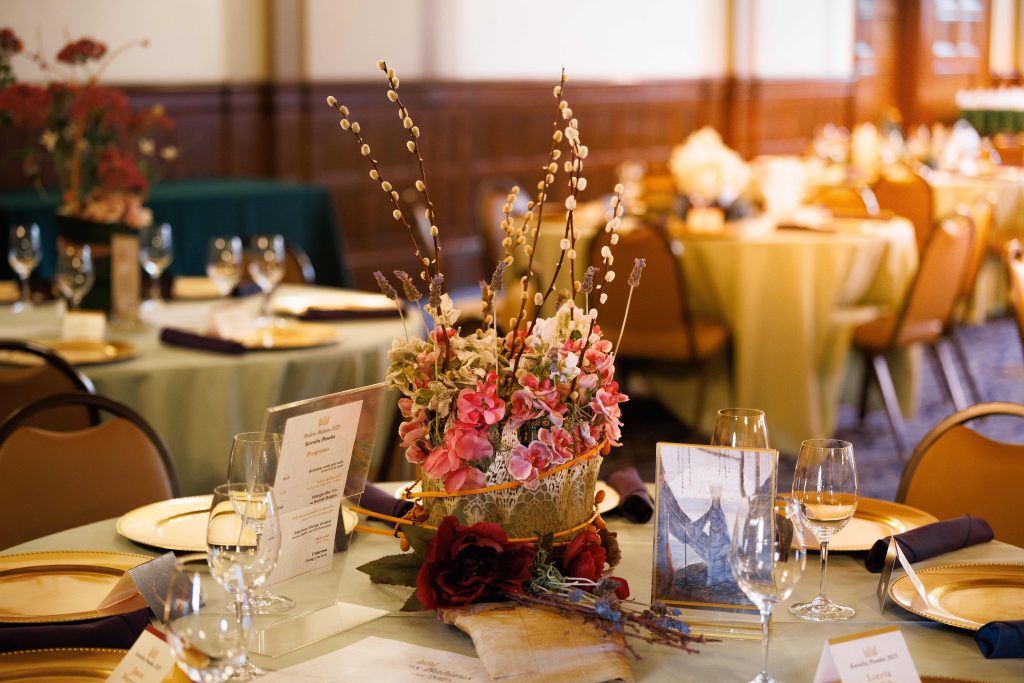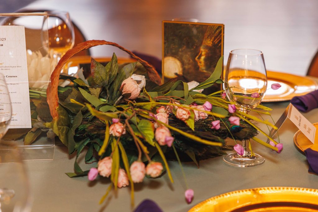 Ant stalų žydėjo specialiai šiam vakarui sukurtos puokštės. Čiurlionio paveikslų nuotaiką Aušra Shtarka ir Danutė Alekna interpretavo savo rankomis ir sukūrė magiškai karališką aplinką.