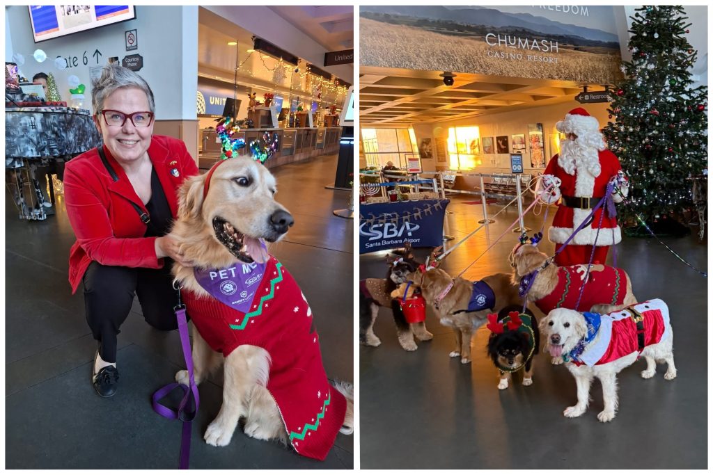 Oro uosto lankytojus džiugino gyva kalėdinė muzika, Kalėdų Senelis ir jo pagalbininkai Therapy Dogs of Santa Barbara – šunyčių „elniukų“, papuoštų ragais ir kalėdiniais kostiumais, būrys Šypsenų ir geros nuotaikos netrūko!