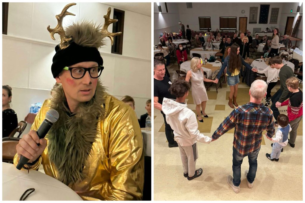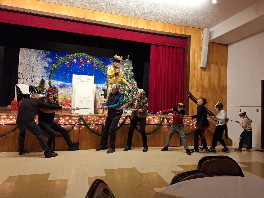 This Year Portland Lithuanian Community Christmas celebration event was special. We were visited by the Golden Moose, who assessed our kindness by subjecting us to multiple tests and challenges. All of us: old and young, tried really hard and accumulated plenty of kindness points to grant our wish for the visit of Santa Clause. The children were prepared to demonstrate their talents so that they could receive the long – awaited and well – earned gifts. We thank Rolandas Dabrukas for such a creative and interactive program! The food was plentiful and delicious, as always.