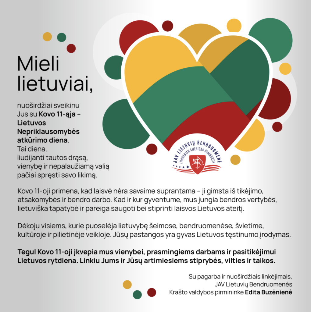 JAV LB Krašto valdybos pirmininkės Editos Buzėnienės kovo 11-osios sveikinimas 2026 metams