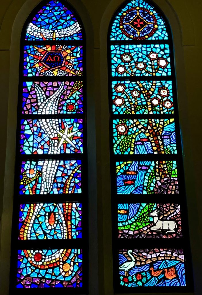 Graikiškos raidės Α ir Ĺ skęsta spalvų judesyje, primenančiame Ramųjį vandenyną. Šviesa juda visą dieną – vitražas niekada neatrodo taip pat. Dievas nėra statiškas. Kai kam gamta atrodė užgožianti religinę žinią, tačiau Bronei gamta buvo Dievo kalba.