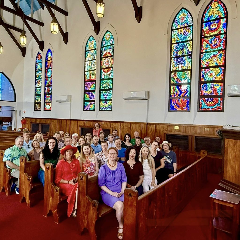 JAV LB Vakarų apygardos lyderystės seminaro Havajuose dalyviai Šv. Petro episkopalinėje bažnyčioje grožėjosi tautietės sukurtais vitražais.
