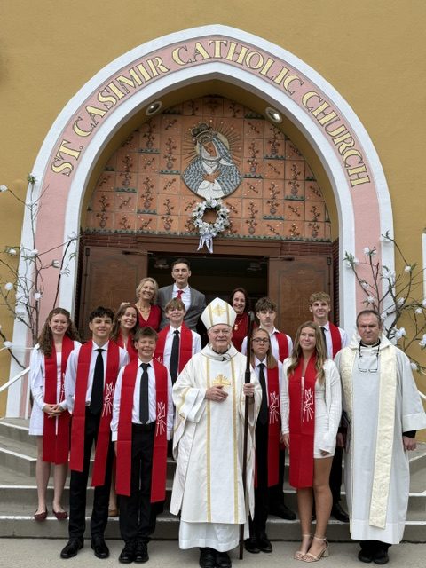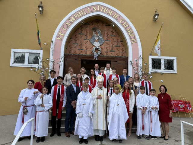 Tik įėjus į bažnyčią sekmadienį, balandžio 12-tą, pasijuto Šventosios Dvasios dvelksmas visoje erdvėje ir maldininkų veiduose. Visi atsisuko į didžiąsias duris, pro kurias įėjo Sutvirtinimo kandidatų, patarnautojų, klebono Tomo ir Jo Ekselencijos Bishop Matthew Elshoff procesija. Pasipuošę raudonom stulom, ties altoriumi rimtai žengė: Vida Rukšėnaitė, Paulius Anelauskas, Nojus Karčiauskas, Dominykas Jonušonis, Jonas Petrušis, Aistė Rukšėnaitė, Benas Borvainas, Aleksija Marshall ir Tadas Pakuckas.