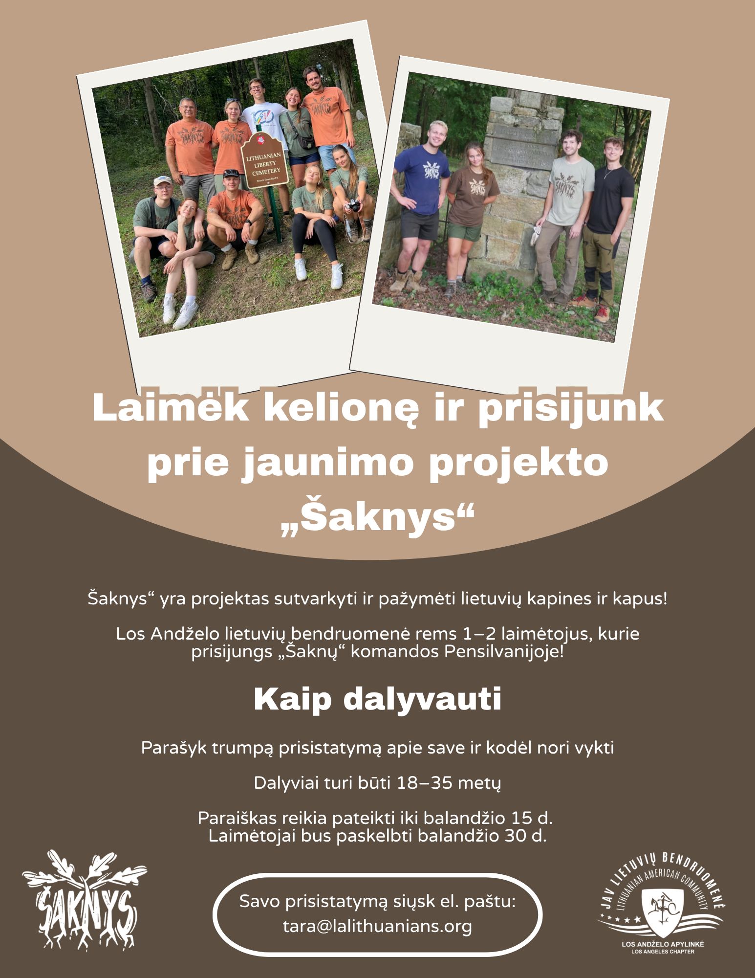„Šaknys” yra projektas sutvarkyti ir pažymėti lietuvių kapines ir kapus! Los Andželo lietuvių bendruomenė rems 1-2 laimėtojus, kurie prisijungs prie „Šaknų” komandos Pensilvanijoje.