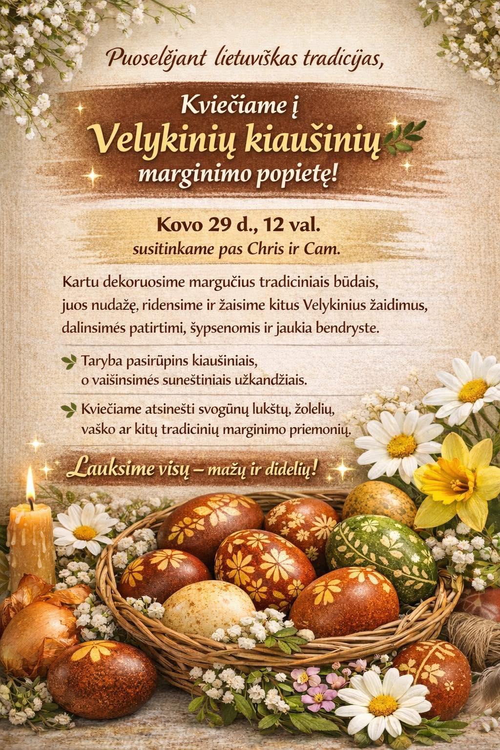 Puoselėjant lietuviškas tradicijas kviečiame visus į velykinių kiaušinių marginimo popietę. Kartu dekoruosime margučius tradiciniais būdais, juos nudažę, ridensime ir žaisime